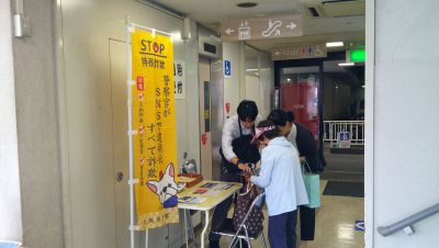 令和7年10月20日 関西スーパー南堀江店前において、西セーフティレディースの方々の協力を得て、西区役所員、西警察署員と共に買い物に来られた方々を対象に特殊詐欺被害防止のチラシ等を配布し、特殊詐欺被害防止を呼び掛けました。また、自転車で来られた方にはご希望により前かごにひったくり防止カバーの無料取付けも行いました。